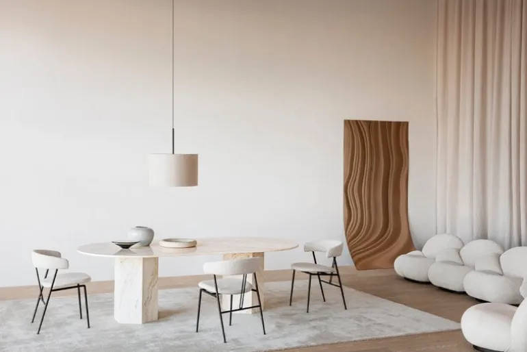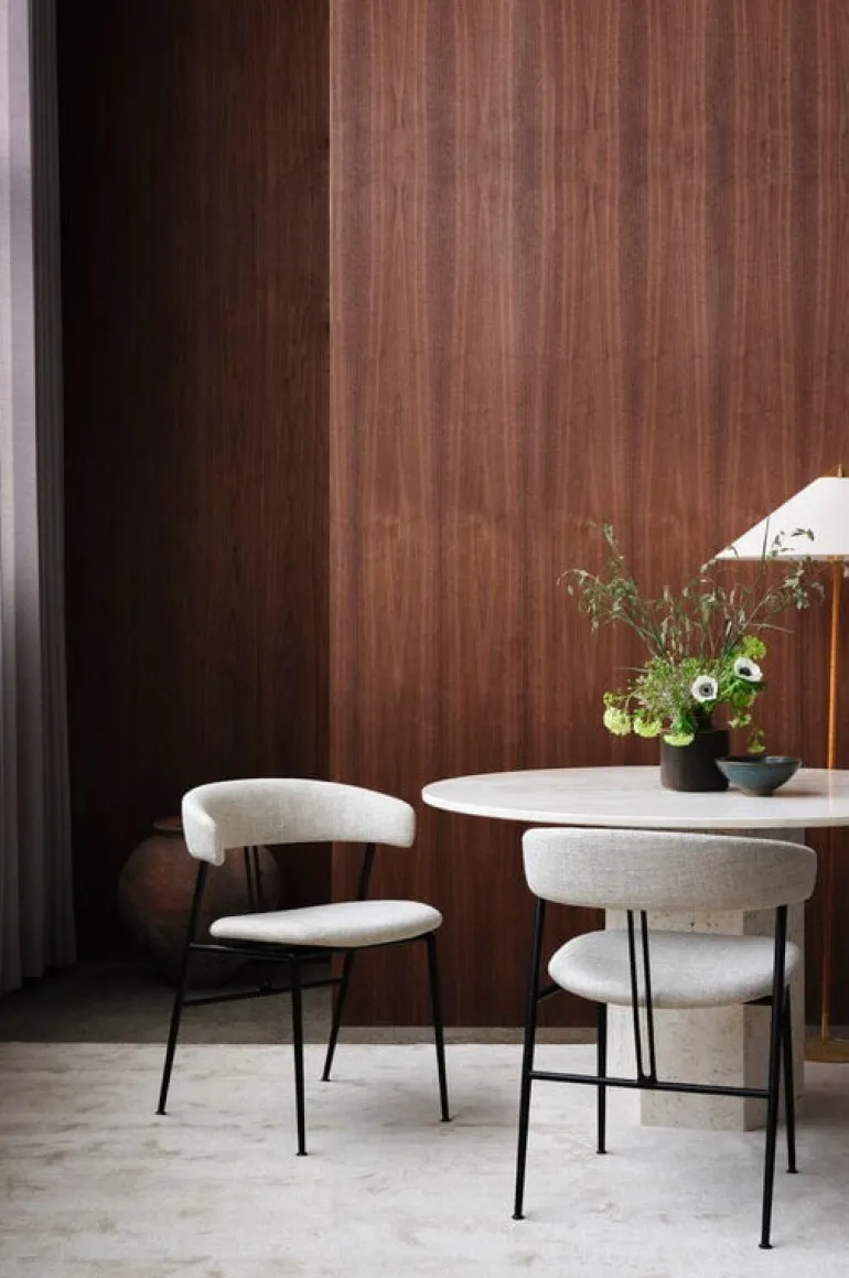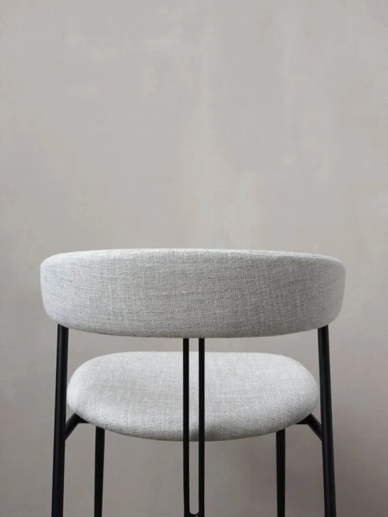 GUBI’s Violin chair, designed by studio GamFratesi, charms with its pure minimalist silhouette, and gentle curvy details. The name of the dining chair refers to two parallel lines on the back resembling the strings of a violin. The powder-coated steel frame and the slender, tapered legs hold the embracing backrest that supports the arms. The contemporary and light appearance of the chair suits well to be deployed in groups around the dining table and the seat provides a comfortable position during meals as well as socializing.