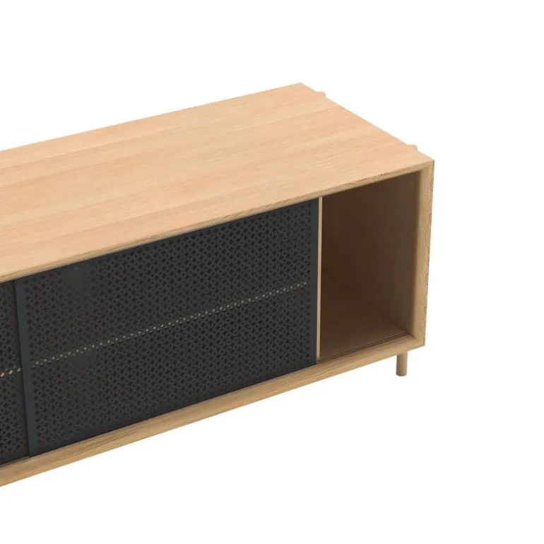The Gabin sideboard by the French brand Hartô plays with the contrast of oak-veneered frame and metallic sliding doors. The perforated pattern softens the appearance of the doors and gives the sideboard an atmospheric look. Gabin is a modern interpretation of vintage vitrines of the 1960s and its perforated pattern was inspired by wicker traditions. Gabin has been manufactured in Europe.