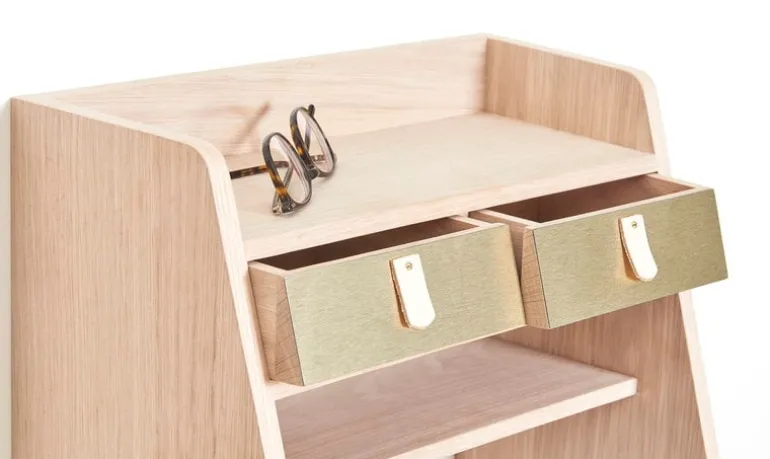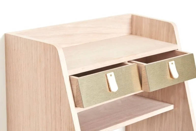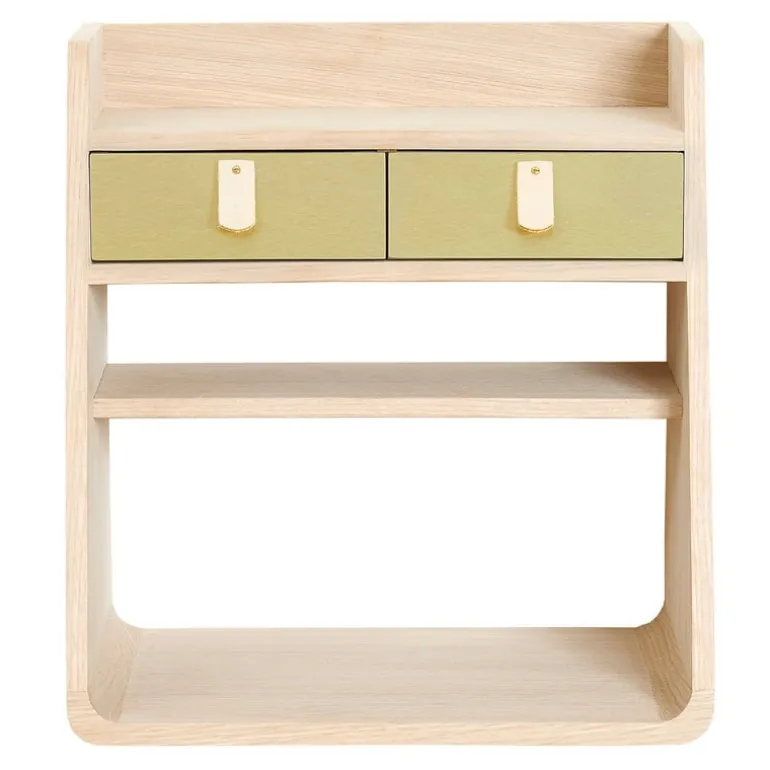 Suzon wall shelf by the French brand Hartô is a versatile, space-saving storage solution that is perfect for a nightstand, hallway furniture or an extra shelf in the office. Suzon features three capacious shelves in oak-veneered MDF, and its elegant appearance is complemented by drawers with brass surface and leather pulls. Suzon was designed by Florence Watine and it has been manufactured in Europe.