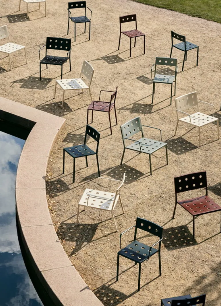 HAY’s Balcony dining chair is part of a clever collection of outdoor furniture designed by the Bouroullec brothers. Made of thin steel sheet, the elegant Balcony outdoor chairs and benches are incomparably light and easy to move – a perfect addition to the garden, patio, terrace or balcony. The round holes pressed through the steel plate provide multiple functions: they add character and softness to the geometrical design and allow rainwater to drain off the chair’s surface, while also strengthening the structure of the furniture. Featuring a weather-resistant coating the Balcony collection is as carefree as it looks.