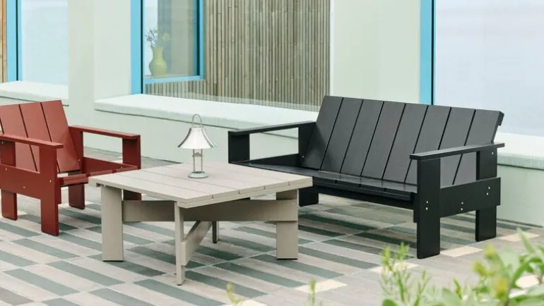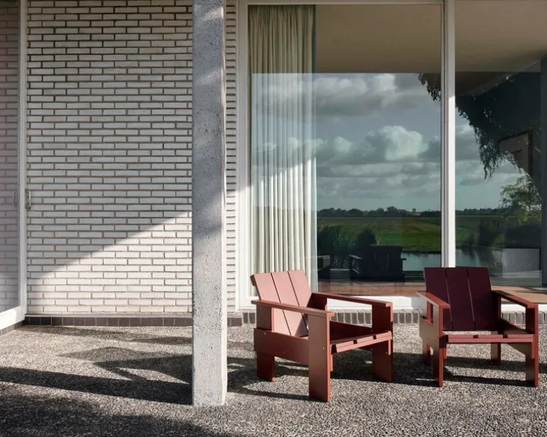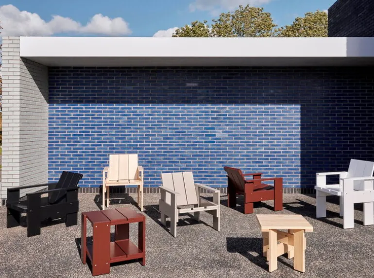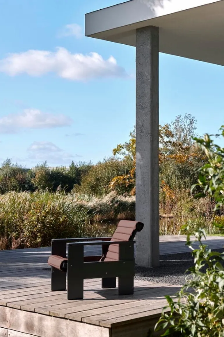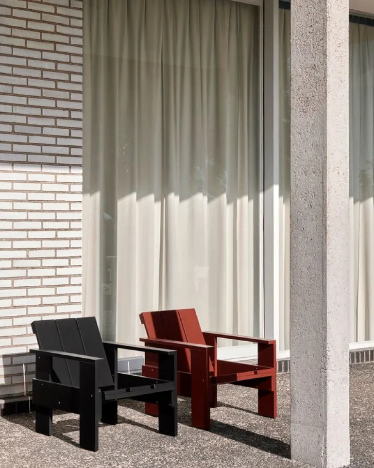 The Crate terrace chair is based on the original chair designed by Dutch architect and designer Gerrit Thomas Rietveld in 1934. At that time, the chair was made from leftover wooden shipping crates, but the Rietveld Originals and HAY reinterpretation uses lacquered pine as the material. Finished with a weatherproof coating, the Crate lounge chair is ideal for outdoor spaces from the terrace to the garden and balcony.