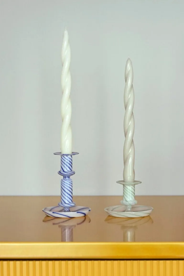Flare by HAY is a modern interpretation of a classic candleholder: milky, delicately translucent glass makes the Flare candleholder a distinctive and fresh addition to your table setting and home decor. The beautiful spiral stripe pattern adds a playful touch to the candleholder’s look. The elegant candleholder is made of durable borosilicate glass.