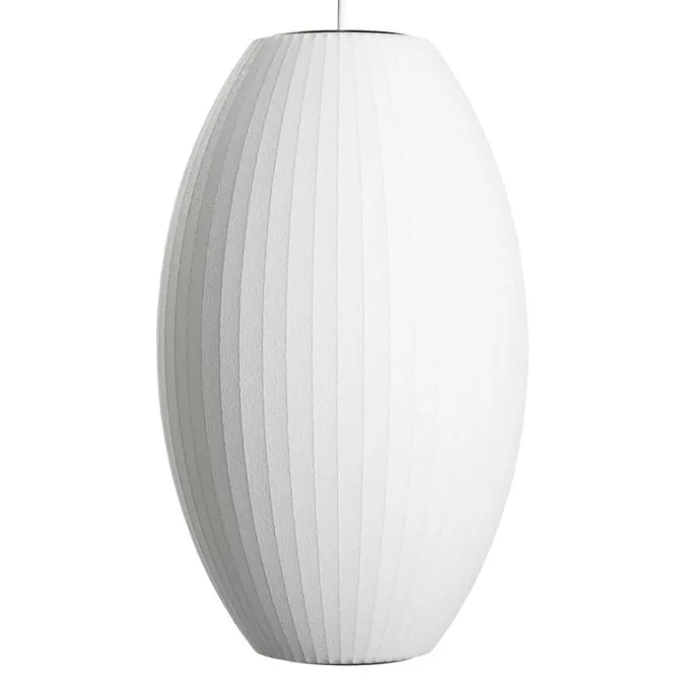 Nelson Cigar Bubble is part of a lighting series designed by George Nelson and produced by Herman Miller in the 1950’s. Nelson wanted to purchase a similar Swedish lamp made of silk, but instead, opted for designing his own version of the pendant to save time and money. The lamps in the collection are still manufactured at the same factory that originally started manufacturing them in 1952.