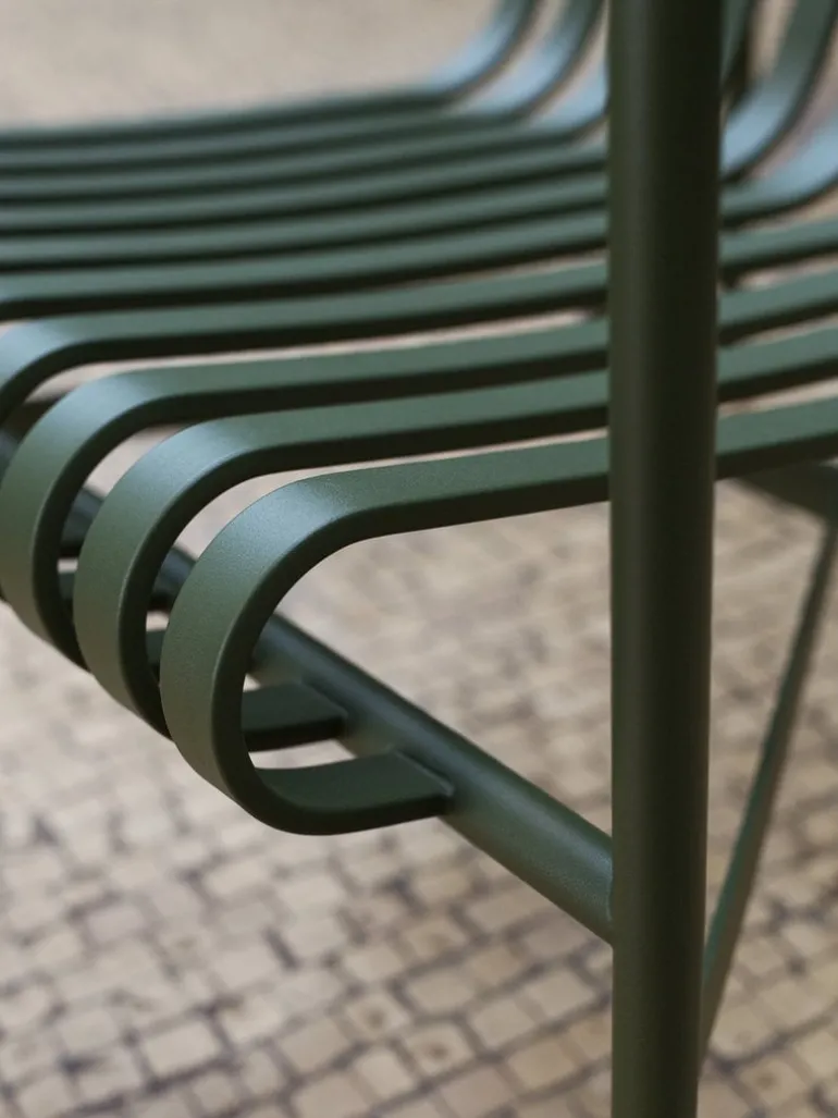The sleek yet robust Palissade dining armchair is a member of HAY’s versatile outdoor furniture collection. Palissade outdoor furniture features a strong, graphic design that consists of simple steel tubes and slats. Ronan and Erwan Bouroullec worked with the collection for two years and created a range of simple, balanced pieces that are well suited for terraces, balconies, gardens, cafés and public spaces. The Palissade chairs, tables and benches are sturdy but elegant, and perfect for outdoor use, since wind and water will pass through the galvanized steel frame. The Palissade furniture was designed to age well and its muted color palette adds to the timeless and versatile appearance.