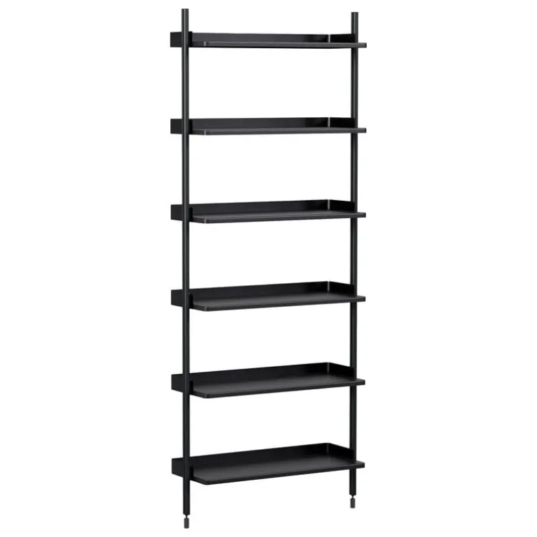 This Pier System 101 storage combination consists of six levels, supported by black plastic brackets. The steel shelves can hold up to 33.07 lbs (15 kg) each and feature a charcoal finish with even a slightly darker back edge, adding a touch of contrast to the sleek, minimalist design. The lightweight yet durable aluminum frame ensures both functionality and timeless style.