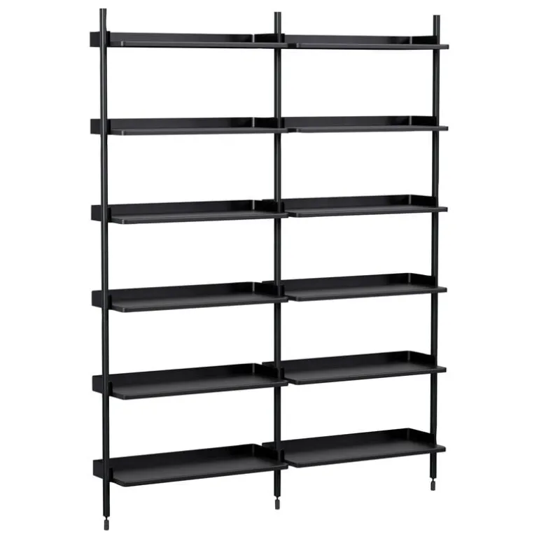 This two-part Pier System 102 storage combination consists of six levels, supported by black plastic brackets. The steel shelves can hold up to 33.07 lbs (15 kg) each and feature a charcoal finish with even a slightly darker back edge, adding a touch of contrast to the sleek, minimalist design. The lightweight yet durable aluminum frame ensures both functionality and timeless style.