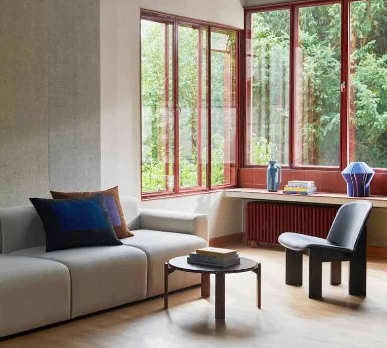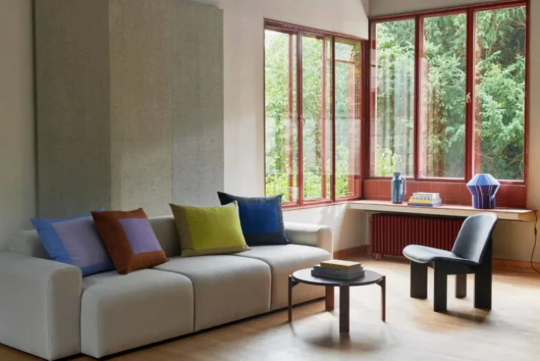 The cushion belongs to the Ram collection, created by Serbian designer Ana Kras, which includes textiles that play with contrasting colors. The beautiful hues not only frame each other but also the room – it’s no coincidence that the name of the collection, Ram, means “frame” in Serbian.