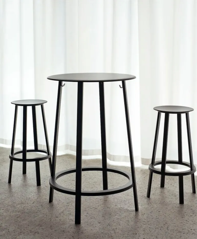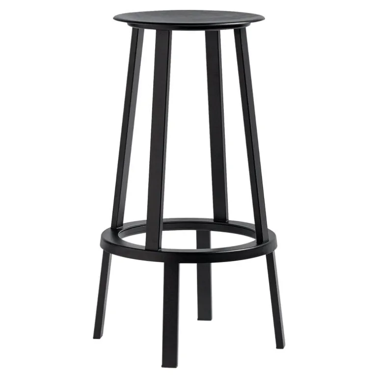 Revolver bar stool by HAY consists of two parts: the sturdy bottom part and the upper seat part that turns 360 degrees. The rotating seat with foor rest is convinient in everyday use. The Revolver bar stool is made of powder coated steel.