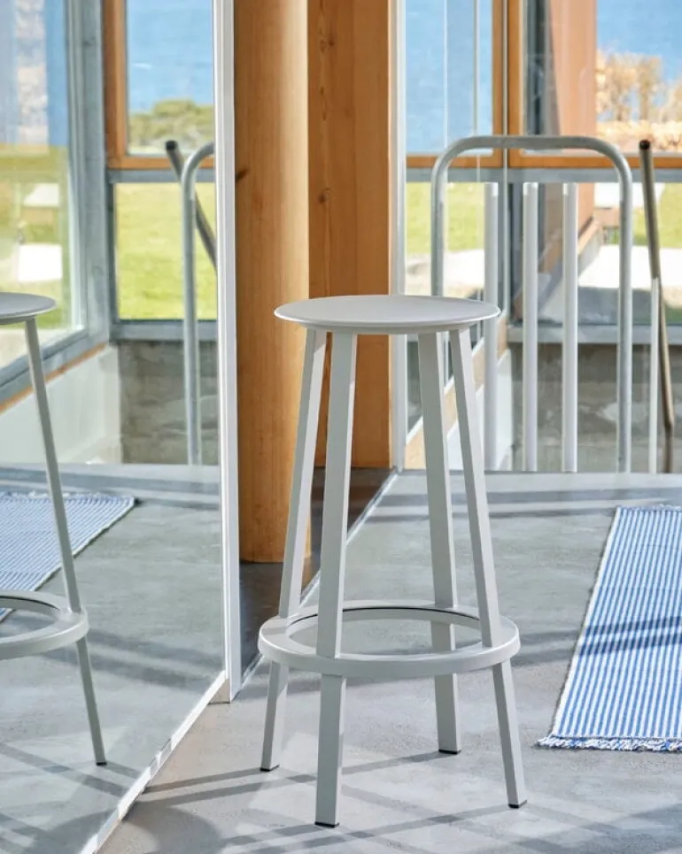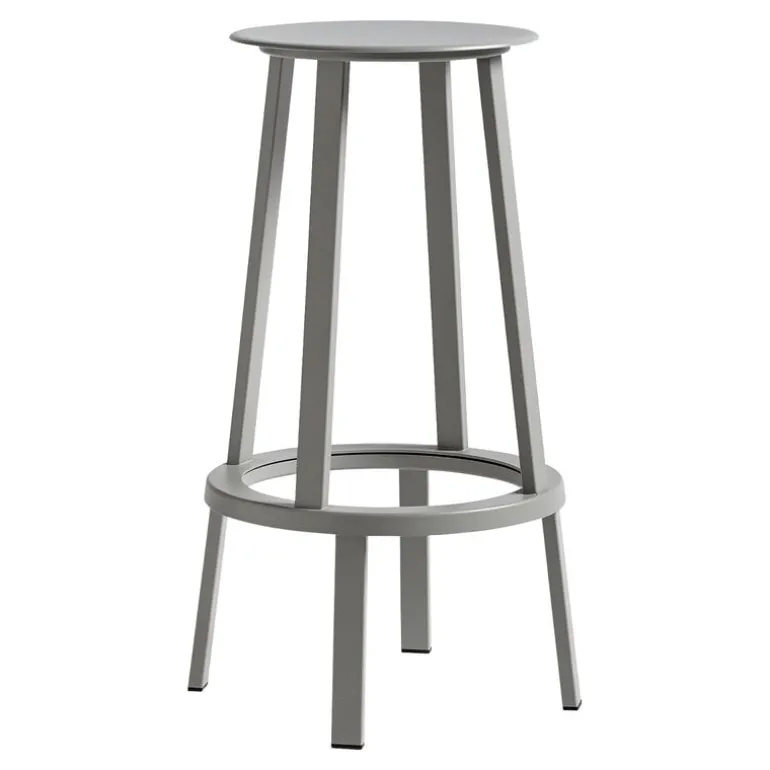 Revolver bar stool by HAY consists of two parts: the sturdy bottom part and the upper seat part that turns 360 degrees. The rotating seat with foor rest is convinient in everyday use. The Revolver bar stool is made of powder coated steel.