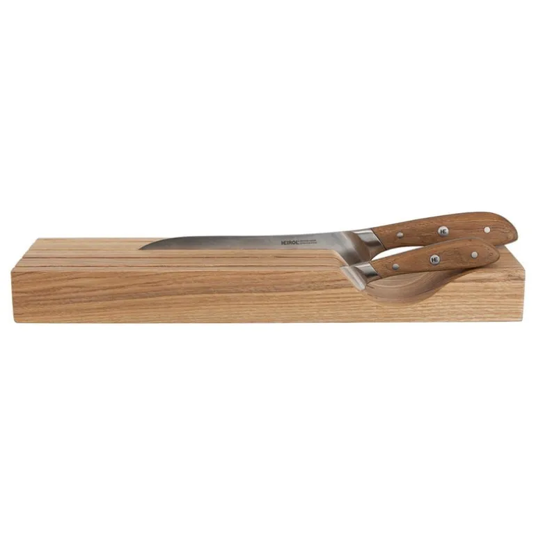 Heirol’s Woody knife block helps keep your kitchen knives safe and sharp when they are not in use. The in-drawer knife holder holds four knives and measures 4.8 x 15.94 x 0 in (12,2 x 40,5 x cm. cm). The block’s height is 1.65 x 0 in (4,2 x cm. cm).