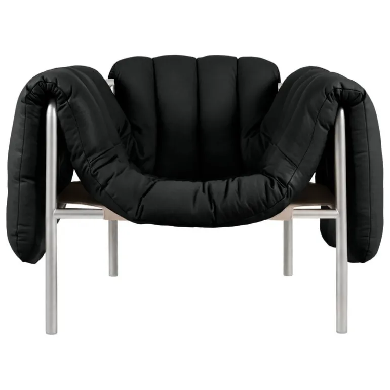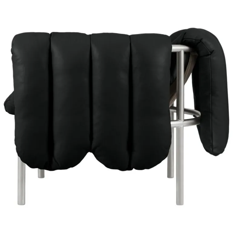 The Puffy lounge chair by Hem charms with a delightful contrast of forms and materials. Designed by Faye Toogood, Puffy consists of a streamlined, tubular steel frame and a plump, detachable leather upholstery that rests freely on the frame. The playful appearance of the Puffy lounge chair adds a relaxed touch to a living room or lobby, and its airy design easily blends into any kind of decor, minimalist or maximalist. Available in a range of color and upholstery options.