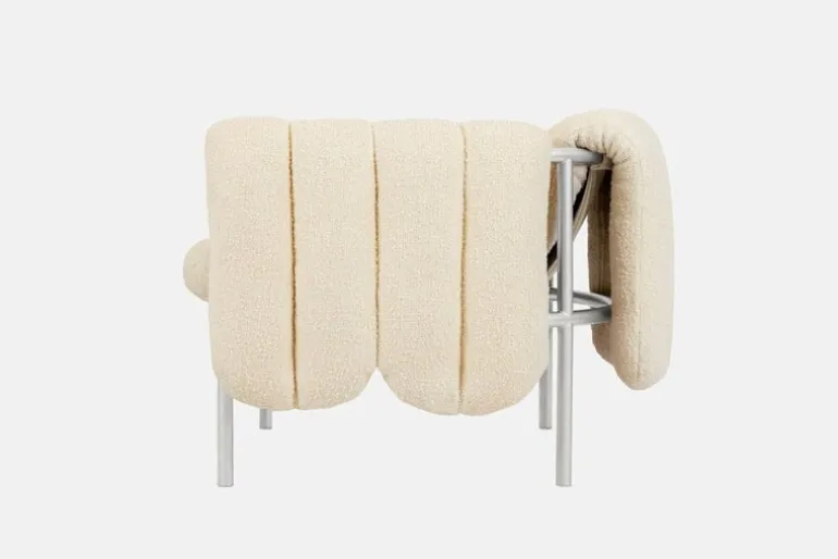 The Puffy lounge chair by Hem charms with a delightful contrast of forms and materials. Designed by Faye Toogood, Puffy consists of a streamlined, tubular steel frame and a plump, detachable bouclé upholstery that rests freely on the frame. The playful appearance of the Puffy lounge chair adds a relaxed touch to a living room or lobby, and its airy design easily blends into any kind of decor, minimalist or maximalist. Available in a range of color and upholstery options.