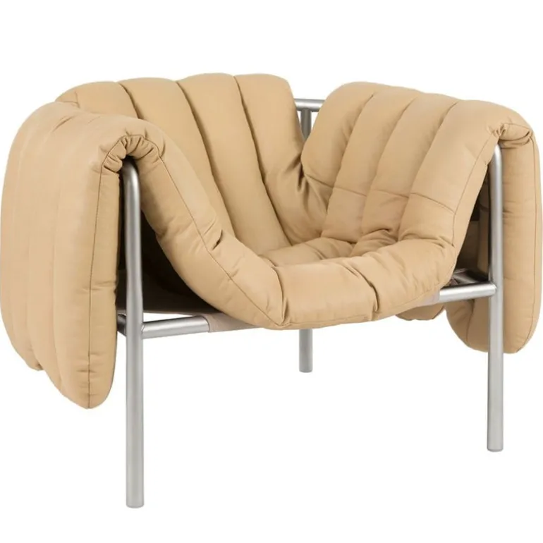 The Puffy lounge chair by Hem charms with a delightful contrast of forms and materials. Designed by Faye Toogood, Puffy consists of a streamlined, tubular steel frame and a plump, detachable upholstery that rests freely on the frame. The playful appearance of the Puffy lounge chair adds a relaxed touch to a living room or lobby, and its airy design easily blends into any kind of decor, minimalist or maximalist. Available in a range of color and upholstery options.