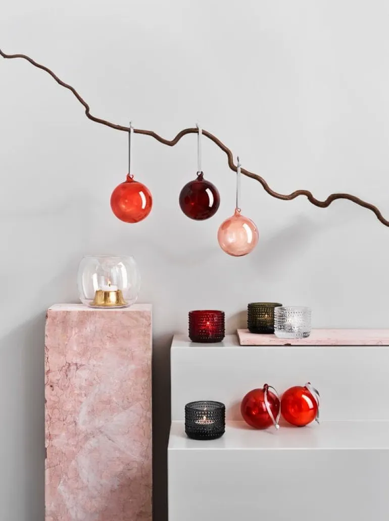 Iittala’s glass ball set includes five ornamental glass balls in different tones of red. The transparent glass balls spread the spirit of Christmas by the window, on the branches of the Christmas tree or given as a gift. Measuring 3.15 in (80 mm) in diameter, the glass balls come with light gray ribbons for hanging and they are packed in a round gift box.