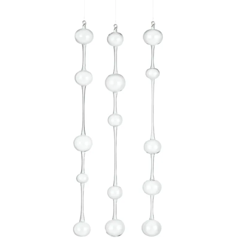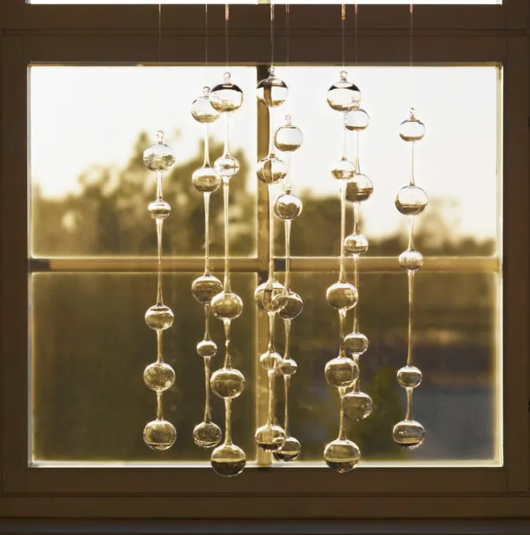 Morning in Athens is a sculpture made of glass pendants. For this sculpture, Kaj Franck was inspired by the beauty of Greece. When moved by the wind, the fragile orbs issue a soft, metallic sound reminiscent of the church bells of Athens on a Sunday morning. Morning in Athens was in production during the years 1954-1975 and 1992-1994 at the Nuutajärvi factory, the oldest glass factory in Finland, and has now being reintroduced. Made from hand-blown glass, Morning in Athens is available in three slightly different models and this set includes all three.