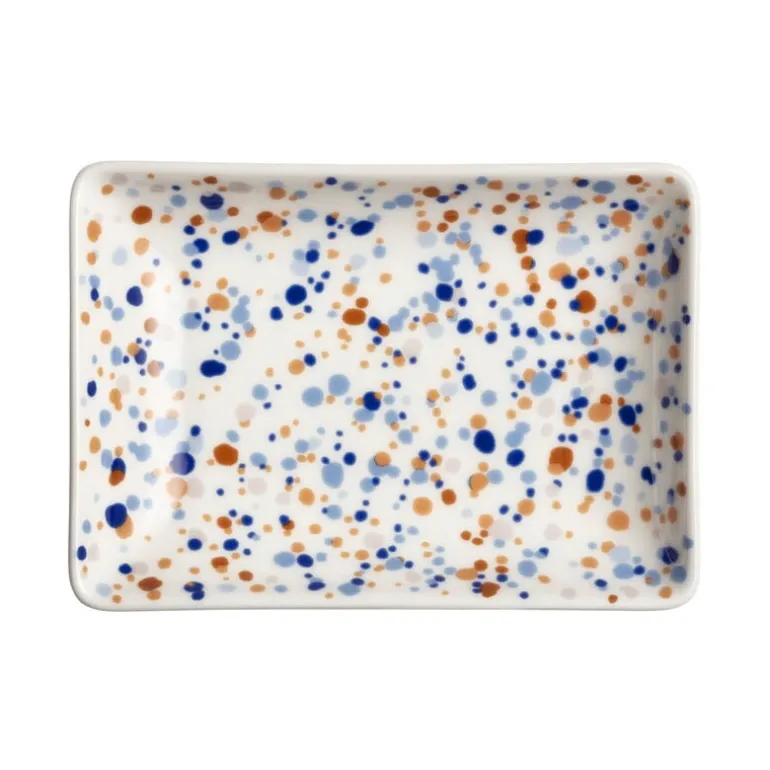 Iittala’s rectangular plate from the Oiva Toikka Collection is adorned with the multicolored Helle print, originally designed for Arabia in the 1980s. The A6-sized plate can be used as a serving dish for snacks and sweets.