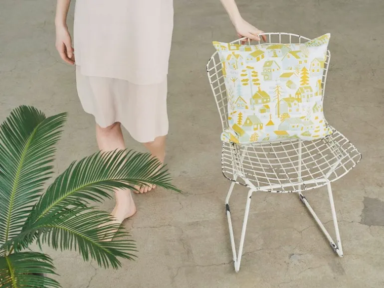Kauniste’s Mökkilä cushion cover features a fun village motif comprising trees and traditional Scandinavian wooden houses, designed by Norwegian illustrator Bjørn Rune Lie. The silkscreen printed cushion cover is made from a mix of linen and cotton, and it has a concealed zipper on the bottom. Suitable for inner cushions that measure 19.69 in (50 cm) x 19.69 x 0 in (50 x cm. cm).