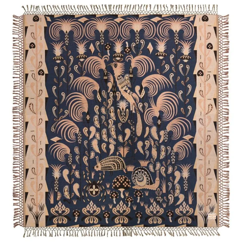 Klaus Haapaniemi’s Bird thrown is illustrated with an ornamental setting of birds and other creatures of the Nordic woods. Made of a high-quality blend of wool and silk, the large, fringed thrown can be used as a blanket for napping or spread on a bed or sofa.