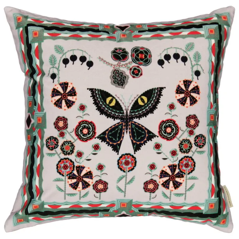 Klaus Haapaniemi’s Scary Cat cushion cover features a fierce, yellow-eyed cat figure with colorful, ornamental details. The square-shaped cushion cover is made of soft cotton velvet and finished with a concealed zip closure, and the back side is adorned with flower and butterfly motifs.