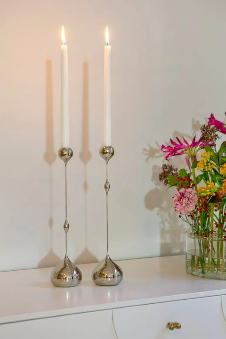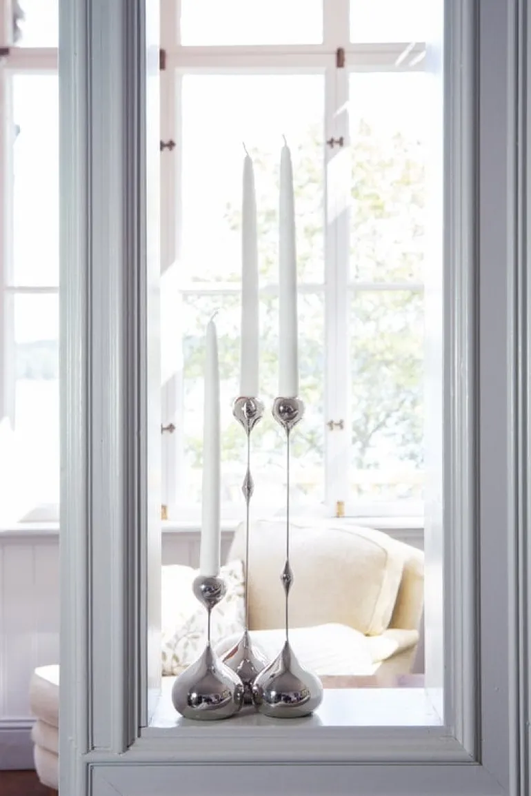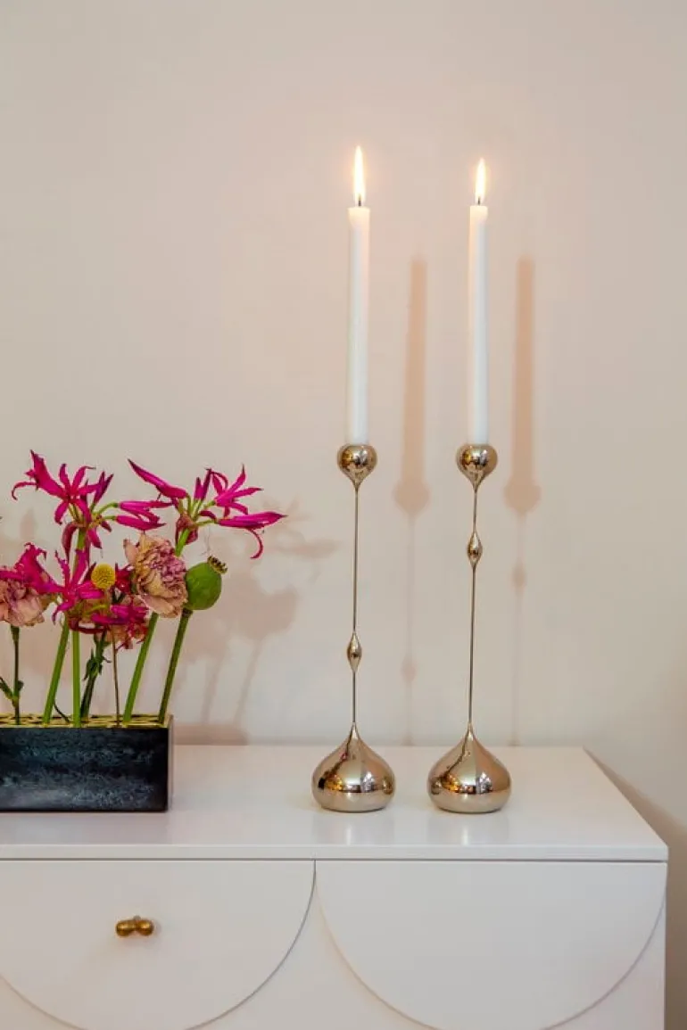 Klong’s Tender candleholder’s design is characterized by its delicate silhouette contrasted by plump drop-like details. Designer Charlotte von der Lancken drew inspiration for Tender’s slender look from the sculptures of Swiss artist Alberto Giacometti. The designer was also inspired by how backlight can fade the outline of an object. The brass, nickel-plated candleholders are available in several sizes with the decorative drops placed at different heights.