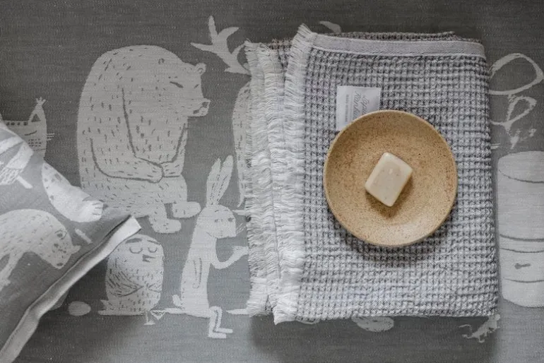 The Eläinten Sauna seat cover by Lapuan Kankurit is adorned with Matti Pikkujämsä’s drawing depicting a group of Finnish animals enjoying a traditional sauna – Eläinten Sauna is Finnish for ”animals’ sauna”. Made of a blend of European linen and organic cotton, the sauna seat cover has a feel of quality and skilled crafting traditions. The Eläinten Sauna seat cover has been woven in Finland at the own weaving mill of Lapuan Kankurit.