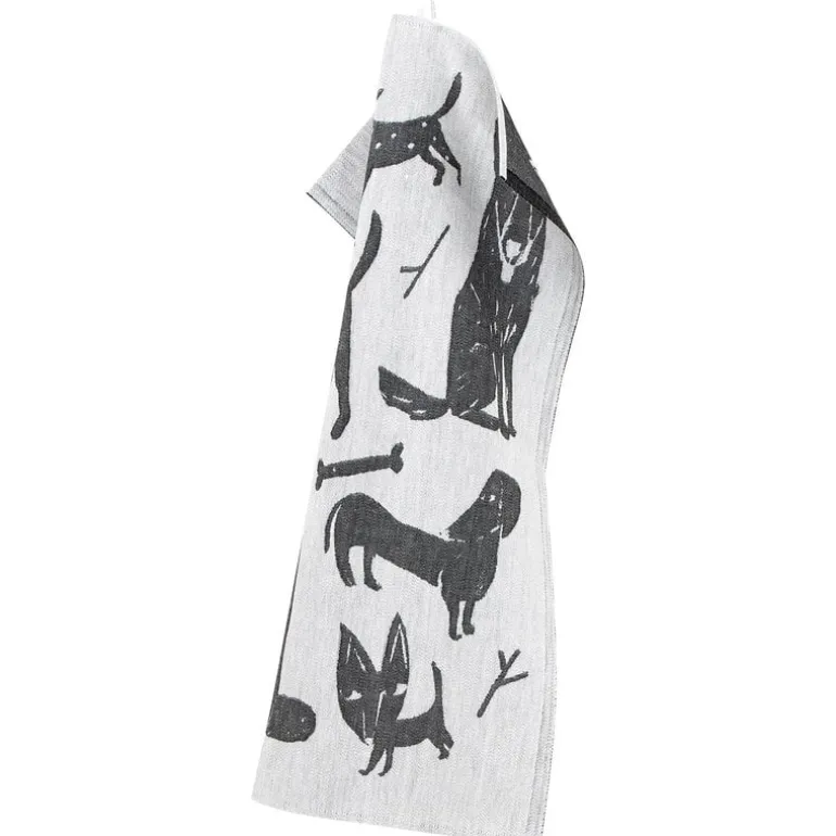 The Koirapuisto tea towel by Lapuan Kankurit is adorned with a joyful pack of dogs drawn by Finnish illustrator Matti Pikkujämsä. Koirapuisto is Finnish for ”dog park”. The black-and-white color palette gives the towel a graphic appearance, and the pattern repeats on the other side with opposite colors. The tea towel is made of a high-quality blend of linen and cotton, and it has been woven in Finland at the own weaving mill of Lapuan Kankurit.