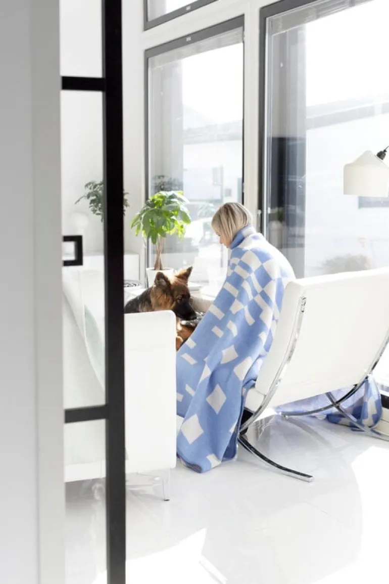 The Koodi blanket by Lapuan Kankurit is decorated with a delightfully asymmetrical checkered pattern designed by Elina Helenius. It is based on one of Helenius’ earlier designs, Huvila, and the extra-long woven fabric she created for the 50th-anniversary exhibition of Lapuan Kankurit in 2023: Koodi presents a detail from the compositions of 4.5-meter-long fabric.