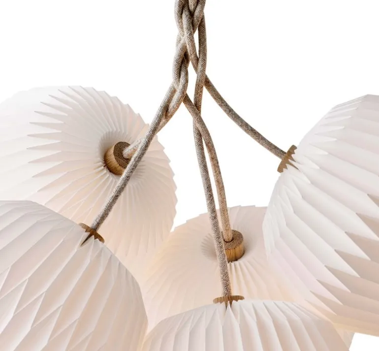 Le Klint 130, also known as The Bouquet, is a modern day chandelier that can be used anywhere in your home. The 130M5 pendant provides a soft, atmospheric light and, with its cluster of five hand-folded shades, is a decorative addition to any room even when the lights are off. The Bouquet’s plaited fabric-coated cable adds a stylish touch to the design.