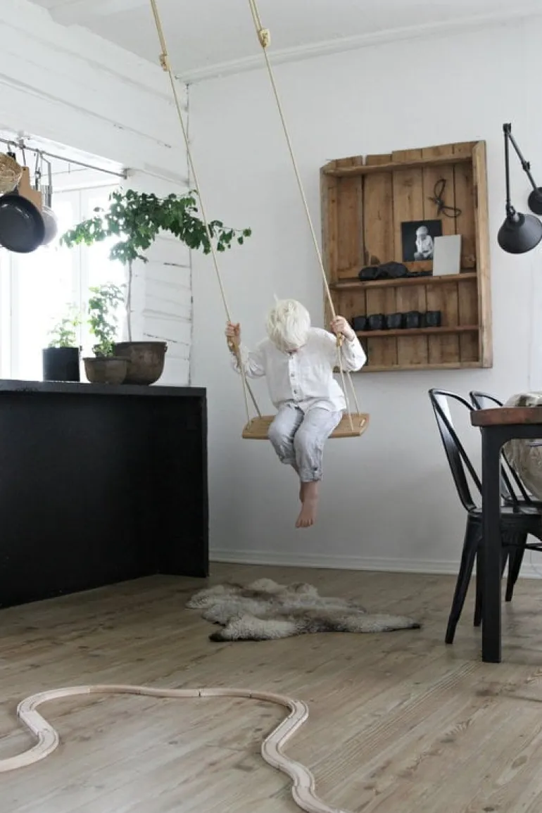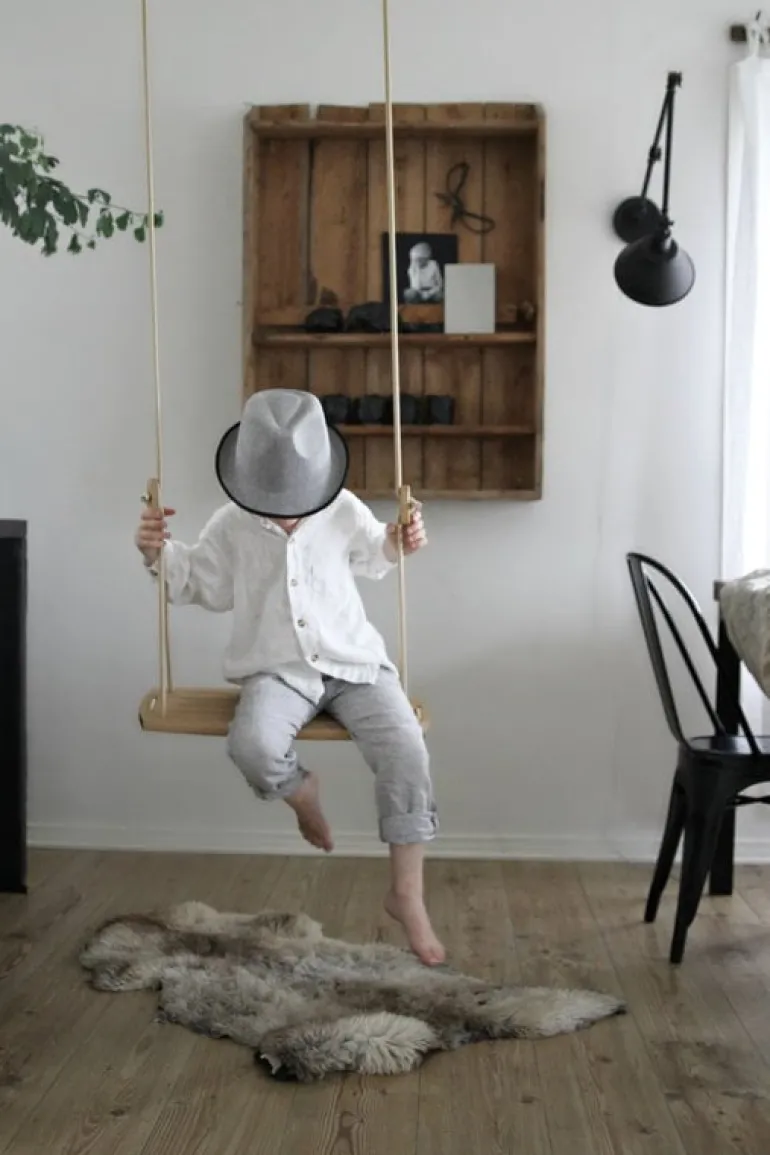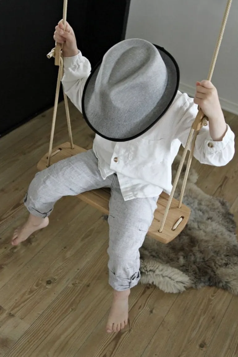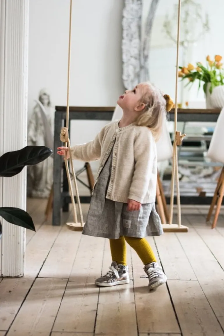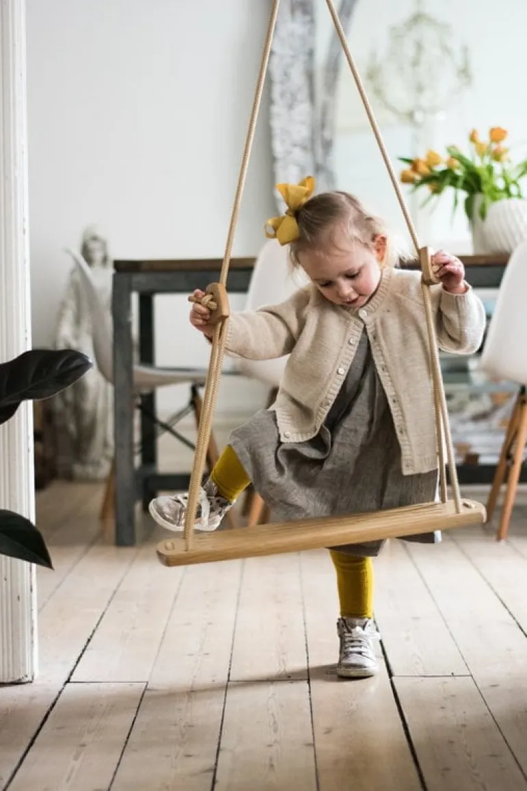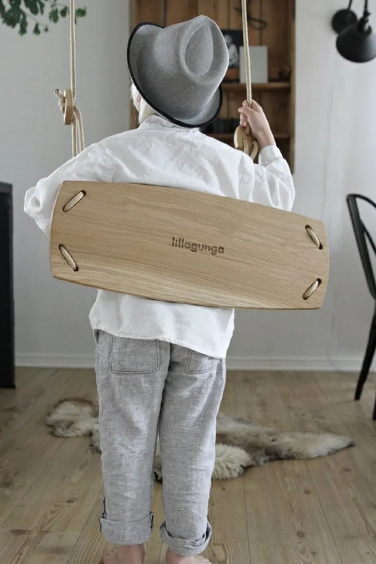 Grand swing by Lillagunga is a reinvented version of a classic wooden swing, especially designed for grown-up kids and adults. Lillagunga believes that besides playing and having fun, swinging is also a perfect way to relax, stay young and live in the moment. Made of sturdy solid wood, the capacious Grand swing is perfect for homes, offices, bars and terraces. A patented mechanism for attaching the ropes and adjusting the height of the seat makes it easy and secure to use. The seat has five imprints that increase friction and comfort. Designed and manufactured in Finland, the elegant Lillagunga products have been built to last.