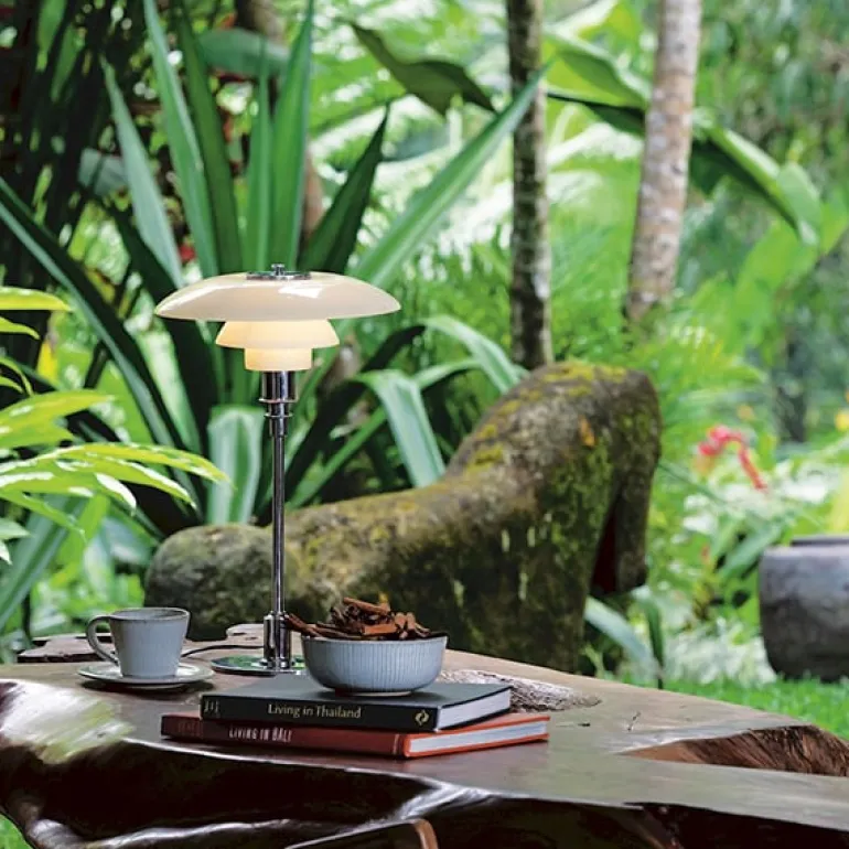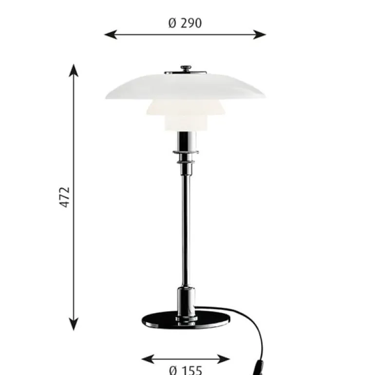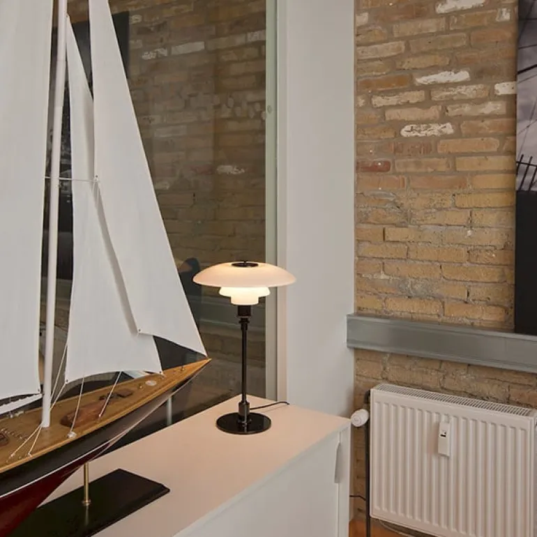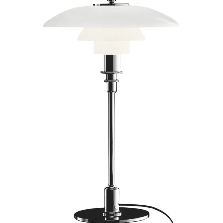 PH 3/2 table lamp is a member of the PH lamp family based on the three-shade system invented in the 1920s by Poul Henningsen. This beautiful table lamp is made of hand-blown white opal glass shades, which have been sandblasted on the undersides to create unique illumination.