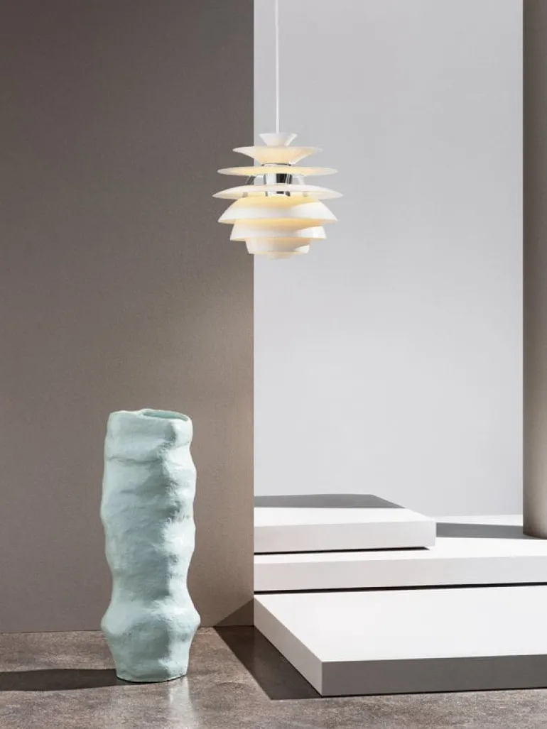 The PH Snowball pendant light, designed by Poul Henningsen in 1958, has been manufactured by Louis Poulsen since 1983. The PH Snowball is distinguished by its layered structure of rounded shades that reflect light in an expressive yet soft manner. The glossed top surfaces and matted undersides create together a glowing effect, and the non-glossy undersides prevent reflections and glare.