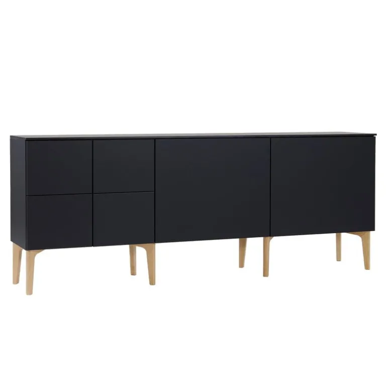 The Fuuga sideboard by Lundia is a clever and gorgeous storage solution for all spaces. Consisting of three modules, the sideboard features a silky finish that repels fingerprints and makes the elegant piece especially durable – perfect for everyday use. Four smaller sections and two cabinets with adjustable shelves make organizing easy, while the top plate and push-to-open doors give the ensemble a tidy, harmonious appearance. The Fuuga sideboard stands on streamlined legs crafted from solid oak.