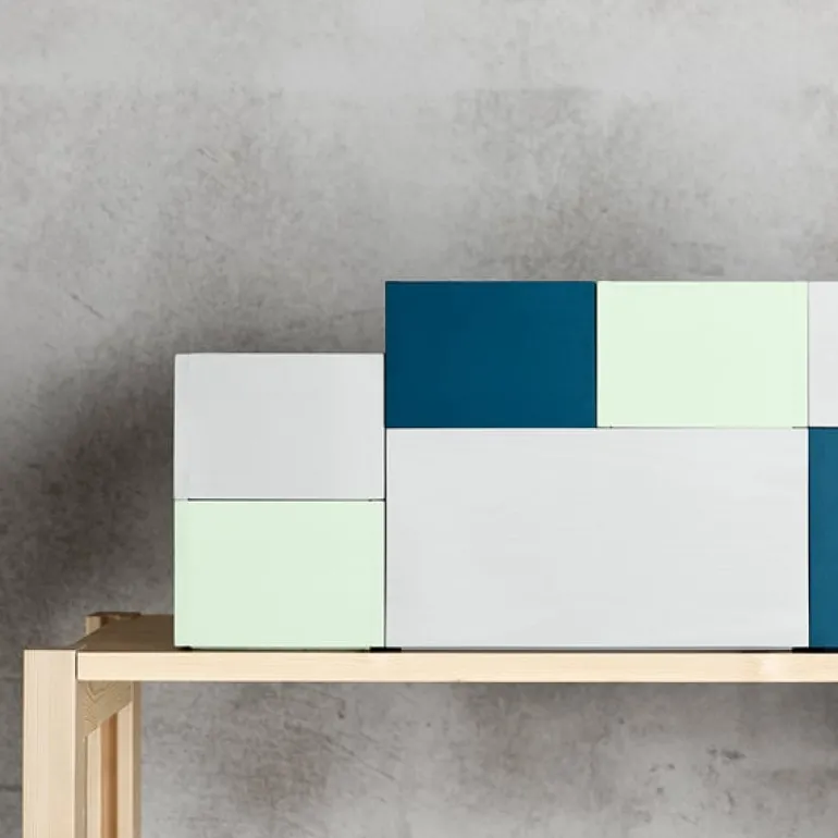 The wooden System boxes, designed by Joanna Laajisto for Lundia, are perfect for storing small objects and magazines. They fit perfectly into Lundia’s Classic shelving system and can also be used as stand-alone elements such as side tables. The System boxes are handmade from pinewood and painted in cool shades of mint, blue and gray, allowing the beautiful wood grain to show through.