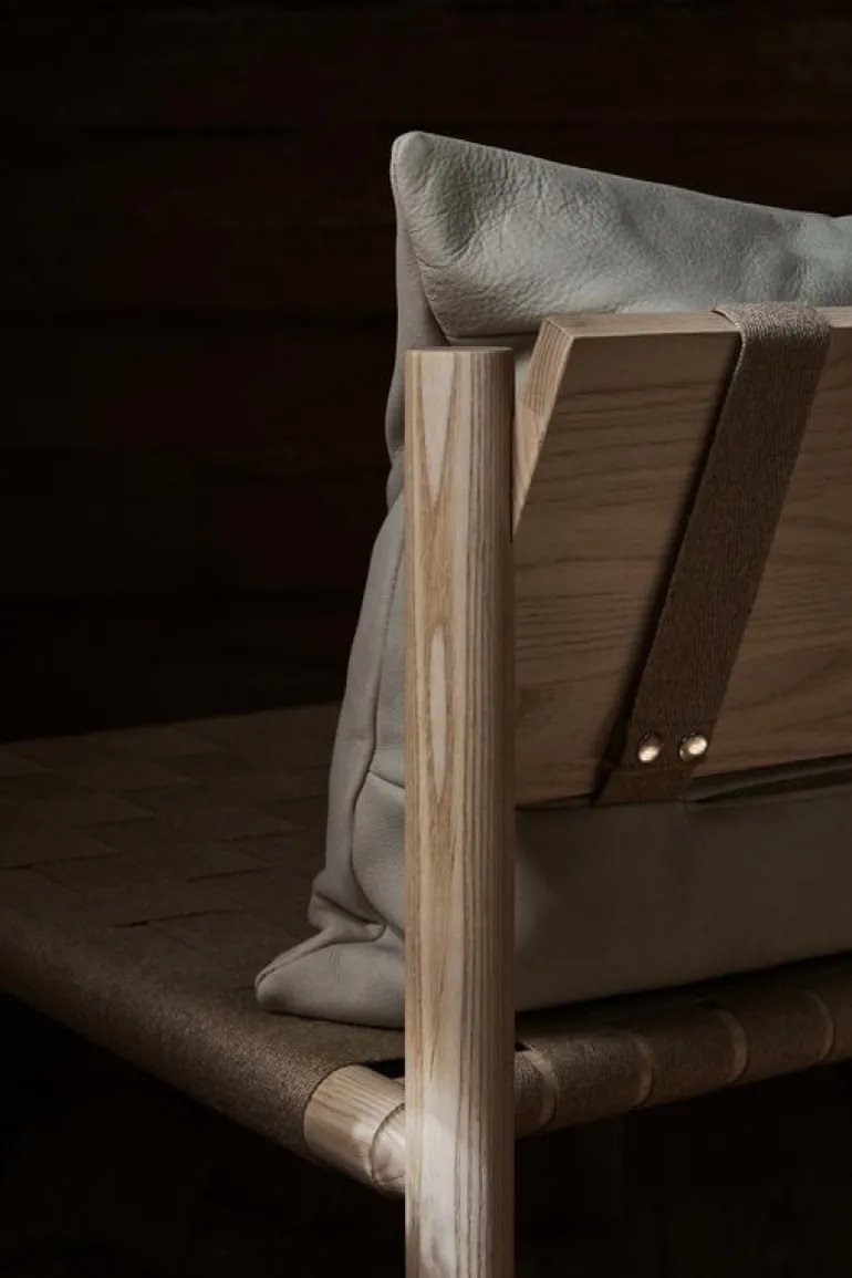 The Kaski lounge chair by Made by Choice boasts a charmingly minimalist look that fuses modern, clean lines with a distinctively rustic flair. The chair comprises a slender frame in ash wood complemented by a linen weave seat and a leather cushion that adds a soft touch to the design – both literally and visually.