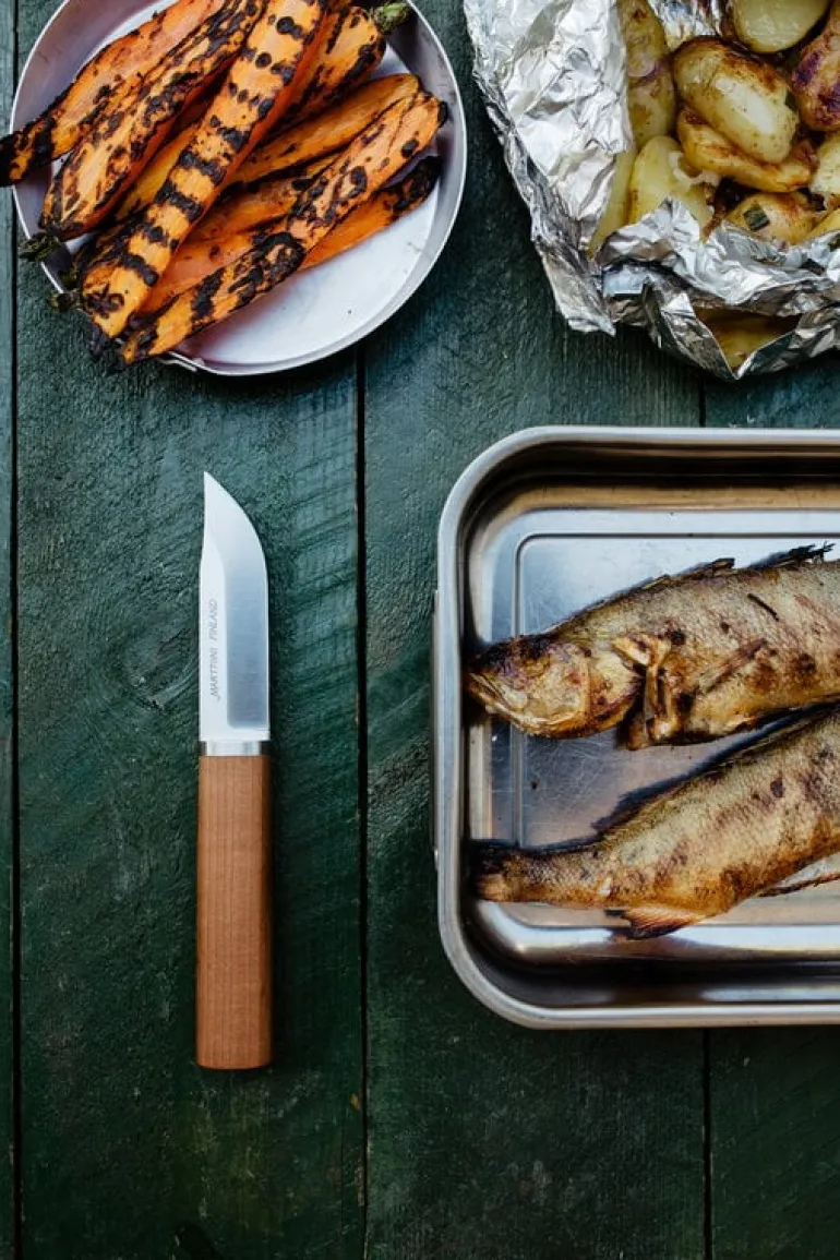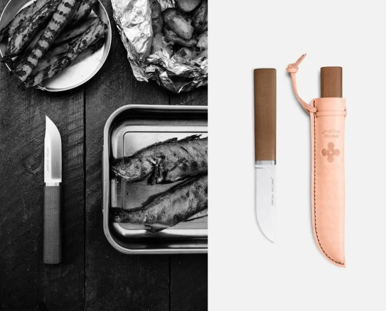 Marttiini’s Cabin Chef knife is a multifunctional universal knife for fishing, camping and cooking. Despite its modern, minimalist appearance, the knife is designed with respect to Marttiini’s knife-making traditions: its stainless steel blade has a slight curve at the tip, originally developed to make it easier to lift a hot coffee pot from an open fire. The knife comes with a traditional leather sheath, adding to the authentic Finnish puukko knife feel.