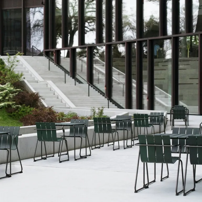 The Ocean OC2 chair by Danish brand Mater is a part of its award-winning Ocean collection – a reinterpretation of the outdoor furniture range designed by Nanna & Jørgen Ditzel in 1955. Besides the exceptionally harmonious form, the materials also make the Ocean OC2 range very unique: the collection has been made using recycled plastic beer kegs in collaboration with Danish beer manufacturer Carlsberg. The seats and tabletops are formed by strong plastic slats, featuring the familiar dark green hue, and the airy design is complemented by a metal frame with a gunmetal finish. All the components are recyclable.