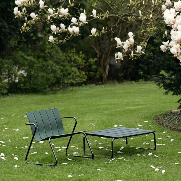 The Ocean OC2 lounge table by Danish brand Mater is a part of its award-winning Ocean collection – a reinterpretation of the outdoor furniture range designed by Nanna & Jørgen Ditzel in 1955. Besides the exceptionally harmonious form, the materials also make the Ocean OC2 range very unique: the collection has been made using recycled plastic beer kegs in collaboration with Danish beer manufacturer Carlsberg. The seats and tabletops are formed by strong plastic slats, featuring the familiar dark green hue, and the airy design is complemented by a metal frame with a gunmetal finish. All the components are recyclable.