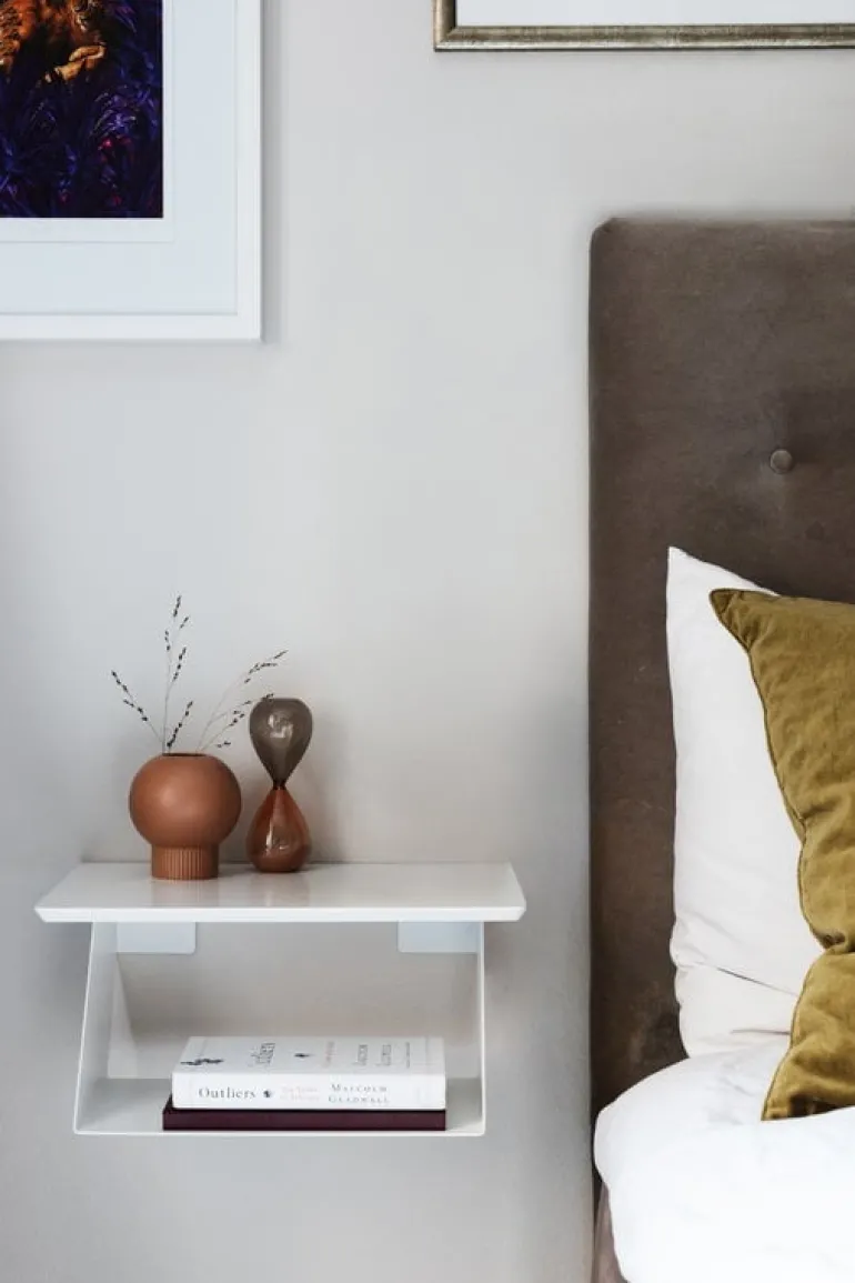 The Edgy shelf from Swedish Maze consists of a small table top and a metal shelf underneath it. The wall-mounted shelf works perfectly as a night stand but can also be placed in other spaces where additional storage is needed, such as the hallway or the living room.
