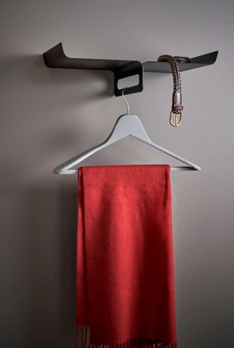 The Kite hat rack, designed by Asshoff & Brogård for Maze, is a playful and lightweight storage solution for your entryway. The sleek metal shelf helps you keep scarves, hats and gloves in order while hangers and hooks can be placed on the bar below. Due to its airy look and small size, Kite is ideal for smaller spaces. The Kite hat rack is made in Sweden.