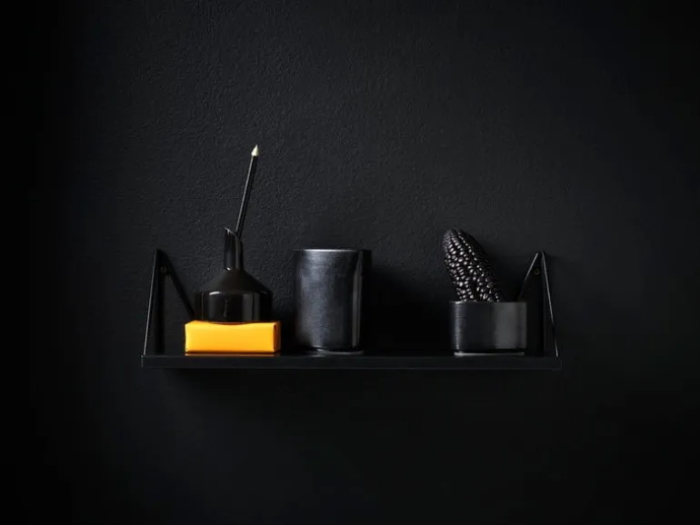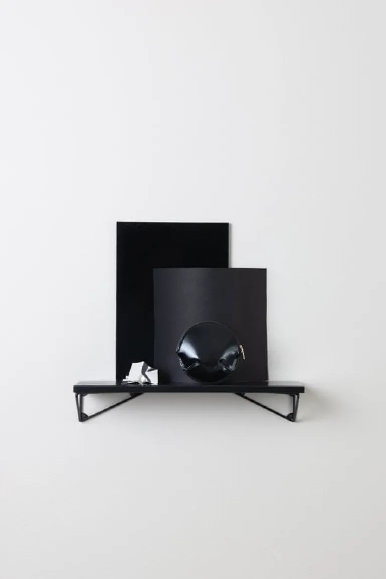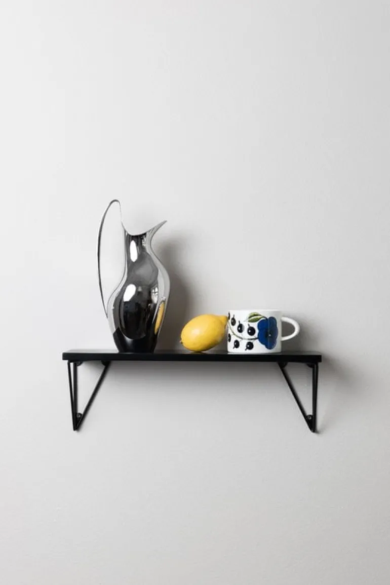The Pythagoras XS shelf comes with two wall brackets made of 100% recycled metal. The wall brackets can be mounted either below or above the shelf in four different positions, and their airy design leaves room for blank space as well. Play, experiment and create the perfect shelf for your own needs!