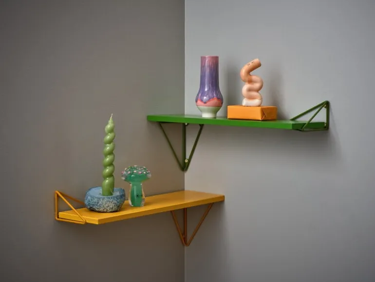 The Pythagoras XS shelf comes with two wall brackets made of 100% recycled metal. The wall brackets can be mounted either below or above the shelf in four different positions, and their airy design leaves room for blank space as well. Play, experiment and create the perfect shelf for your own needs!