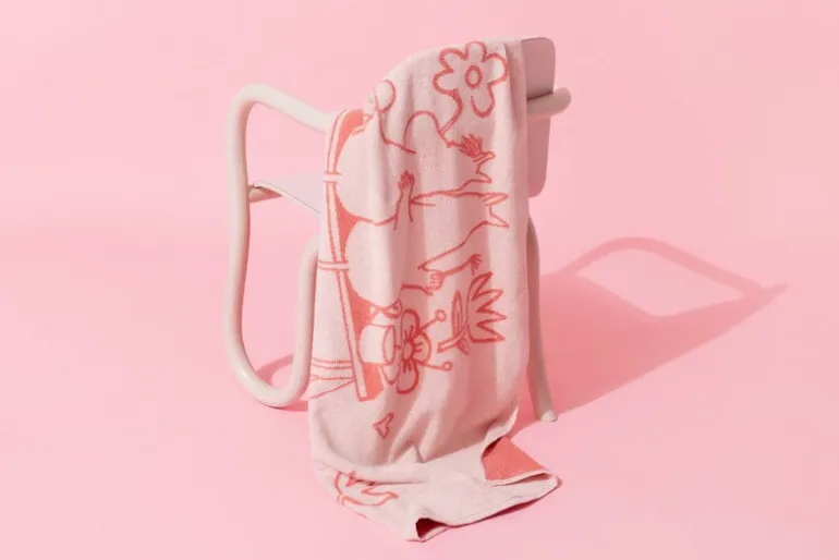 The Love towel by Moomin Arabia brings the enchanting atmosphere of Moominvalley to every day! Made of organic cotton, the towel is adorned with an adorable illustration where Snorkmaiden and Moomintroll paint flowers on the walls of their house. The illustration is based on the comic Moomin Builds a House, in which Moomintroll decides to build a house for himself and Snorkmaiden.