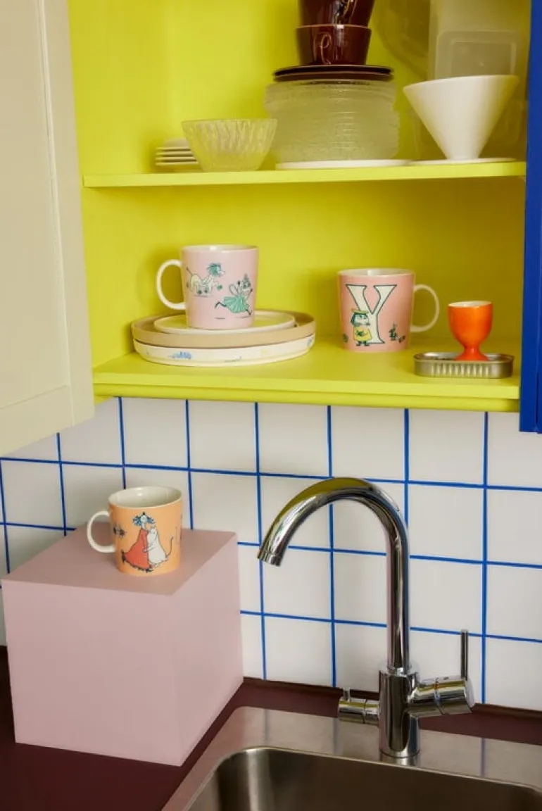 The Moomin ABC mugs are decorated with adorable initials featuring various Moomin characters. The S mug depicts the theater rat Emma peeking out from her hiding place, scrutinizing her guests with a sense of disdain. Their behavior is quite peculiar indeed: the dishes are nailed to the theater’s sloping floor to keep them in place – resulting, of course, in broken dishes. Meanwhile, Mymble is seen running across the stage, escaping from a lion.