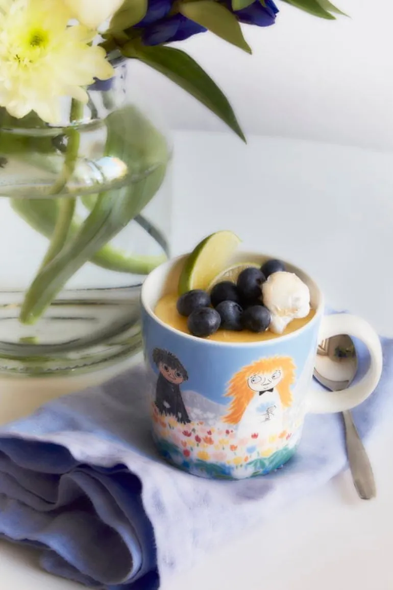 The Friendship mug from Arabia’s Moomin collection is illustrated with a scene from Tove Jansson’s beloved picture book, Who Will Comfort Toffle? (1960). The illustration depicts the magical moment when the story’s lonely, timid main character, Toffle, meets Miffle for the first time in a wildflower meadow.
