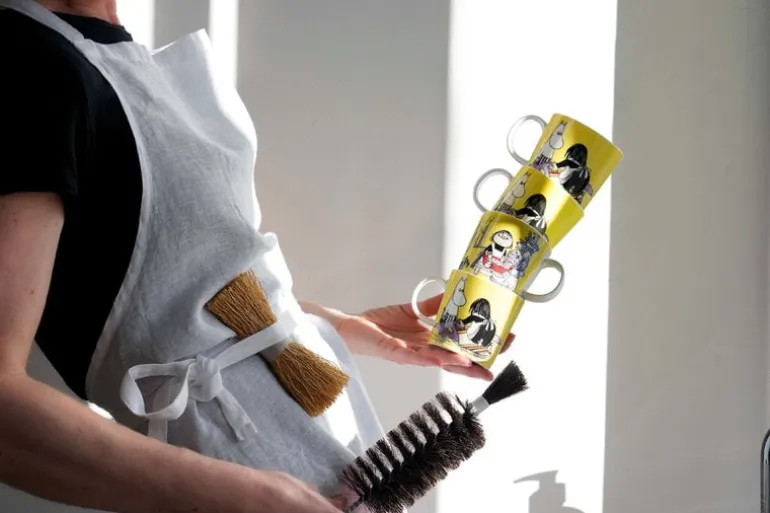 The Misabel mug from Arabia’s Moomin collection features a less-known character, Misabel, who signs on as a maid for the Moomin family. Based on Tove and Lars Jansson’s comic strip Moominmamma’s Maid, the mug’s illustrations portray Misabel washing the Moomin family’s dishes, accompanied by her dog Sorry-oo, and cleaning the rugs in a lake as instructed by Moominmamma. The timid and somewhat neurotic Misabel is not entirely convinced on Moominmamma’s habits of always washing dishes with rainwater and swimming with rugs to rinse them after cleaning.