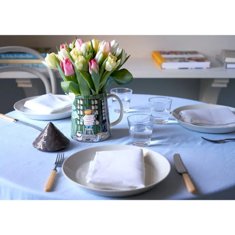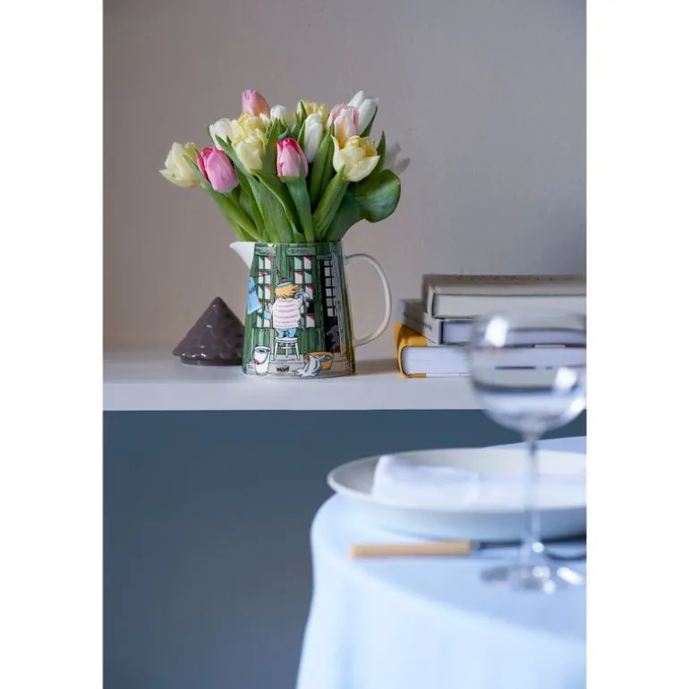 The Bath house pitcher from Arabia’s Moomin collection is illustrated with a scene from Tove Jansson’s book Moominland Midwinter, in which the rest of the Moomin family is fast asleep, but Moomintroll and Little My have woken up from hibernation. In the pitcher’s illustration, the two have found their way to the family’s bath house where their friend Too-ticky resides during winter. Too-ticky is cleaning the windows and airing towels to make the bath house ready for spring, while Little My makes the most of the frozen sea by fashioning skates out of Moominmamma’s kitchen knives.