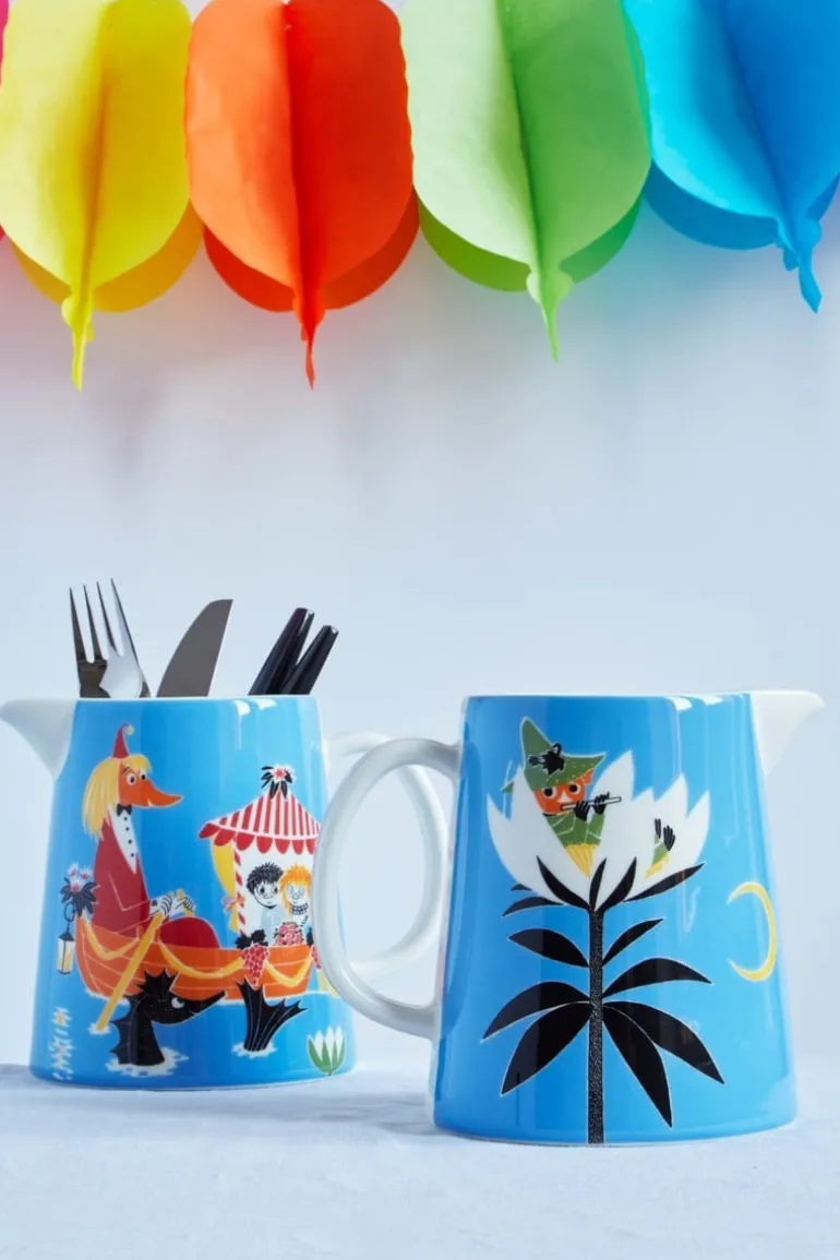 Arabia’s Friendship pitcher is adorned with a lovely print on a blue background. The Moomin Friendship collection features illustrations based on Tove Jansson’s storybook, Who Will Comfort Toffle?, where lonely Toffle, after exciting adventures, finds himself a true friend. The ceramic pitcher’s volume is 1 liter, and it has a white handle and spout.