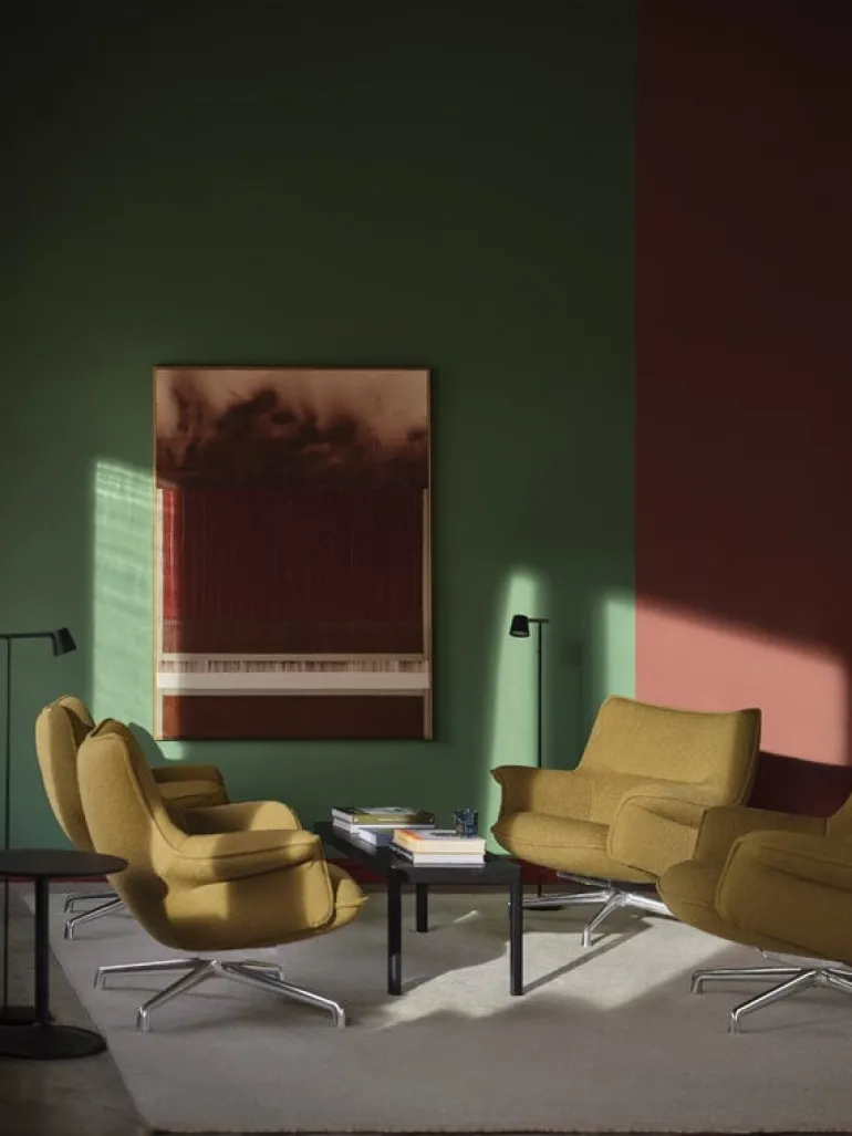 Muuto’s Doze lounge chair is characterized by the juxtaposition of Scandinavian minimalism and the bold expression typical of ’70s design. Designed by Anderssen & Voll, the chair has a distinctively wide backrest – outlined with seams that give the form definition – and slender tube-like legs that accentuate the chair’s robust frame. The swivel chair is perfect for lounge areas in hotels or offices as well as relaxing at home in front of the TV or with a good book.