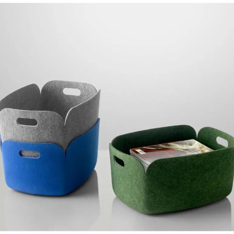 Restore, designed by Mika Tolvanen, is a collection of multifunctional trays and baskets, shaped from durable polymer felt composite. The innovative material is manufactured from the fibers of recycled bottles. Restore trays and baskets feature a simple and pleasant form that is suitable for home and office.
