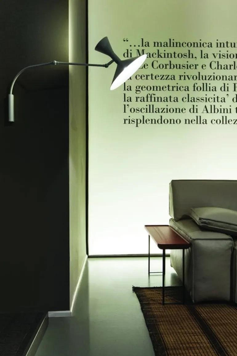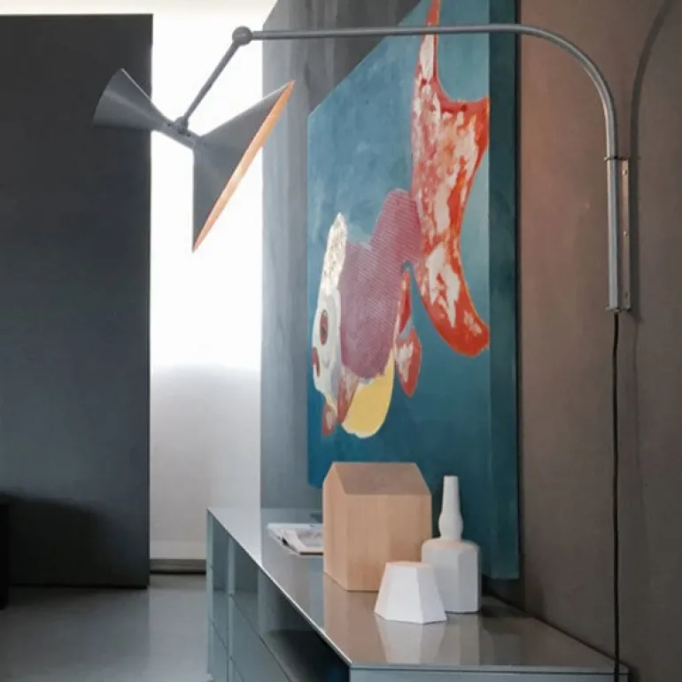 Nemo Lighting’s Lampe de Marseille Mini is a smaller version of the sculptural wall light designed by the world-famous architect Le Corbusier for the Unité d’Habitation in Marseille at the turn of the 1950s. The position of the light is easy to adjust since the arm features two joints and turns from side to side. The striking shade consists of two aluminum cones that offer direct and indirect light. Lampe de Marseille is a true statement piece that has and will stand the test of time.